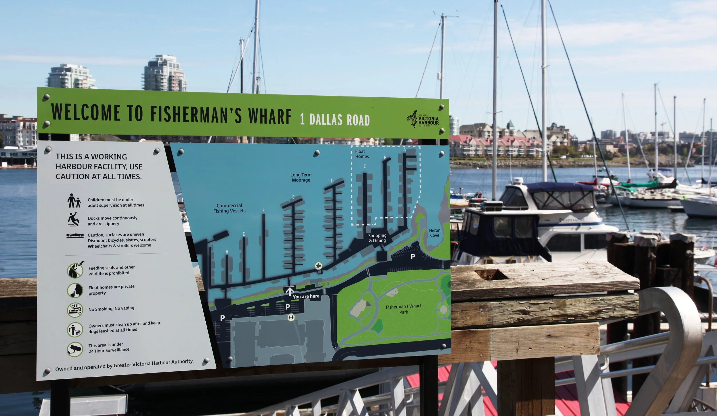 Our team prepared a signage strategy for four tourist-focused sites in downtown Victoria, including Fisherman’s Wharf. Part of a robust process of stakeholder engagement, the work was developed to both encourage visitation to the commercial site and create clear guidelines for safety and behaviour.