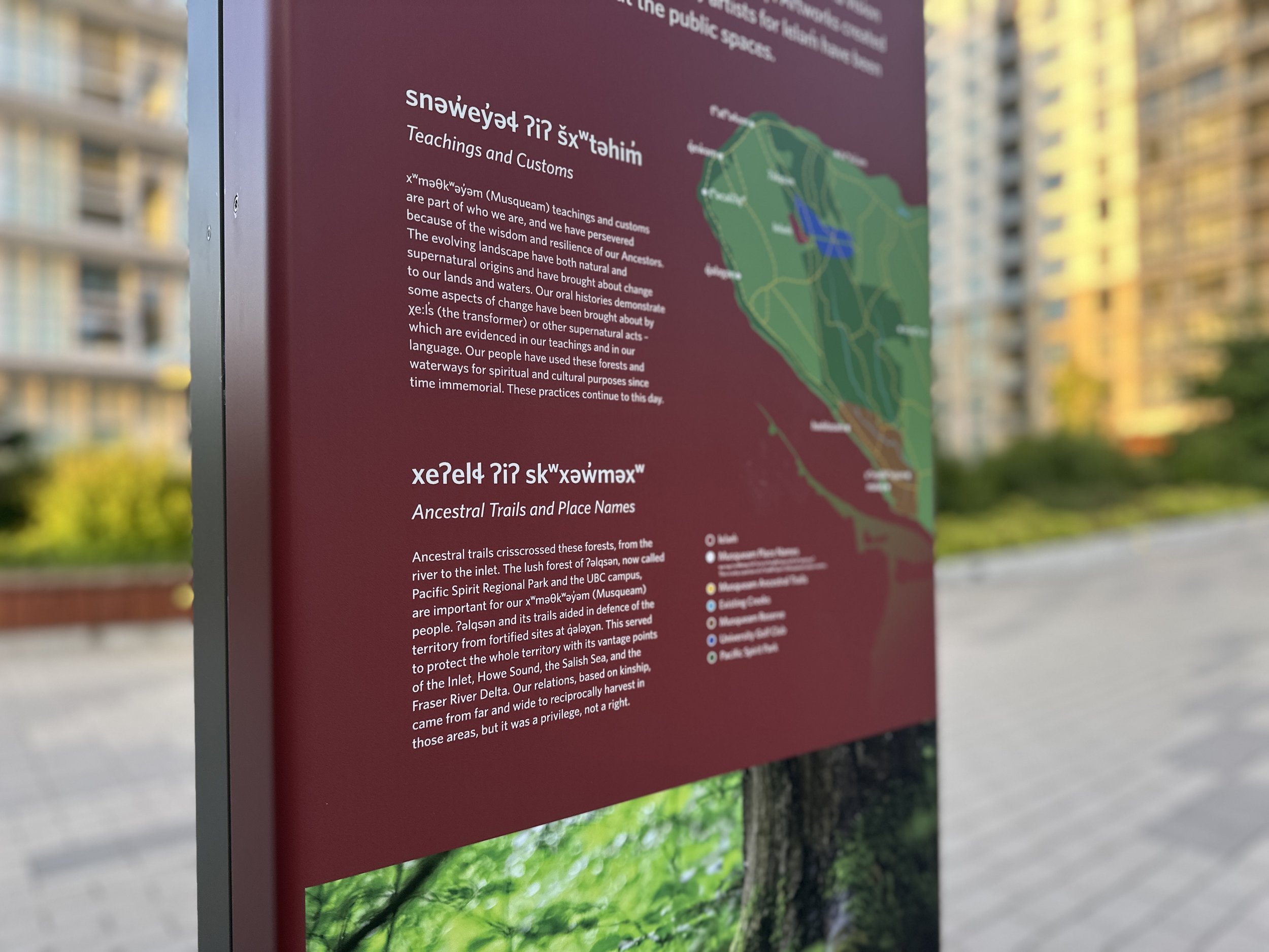 the community in a sense of place and heritage. Lost & Found worked closely with the Musqueam Capital Corporation to develop interpretive and wayfinding signage for this urban development on Musqueam lands. Design elements reflect Musqueam worldviews, traditions, contemporary culture, language, graphic and colour palette, and approaches to materials. Heavy glulam timbers were used to echo architectural features of the development. Aluminum sheet and vinyl maps and graphics provide both a robust but changeable approach to the sign system, allowing for future phase expansion.