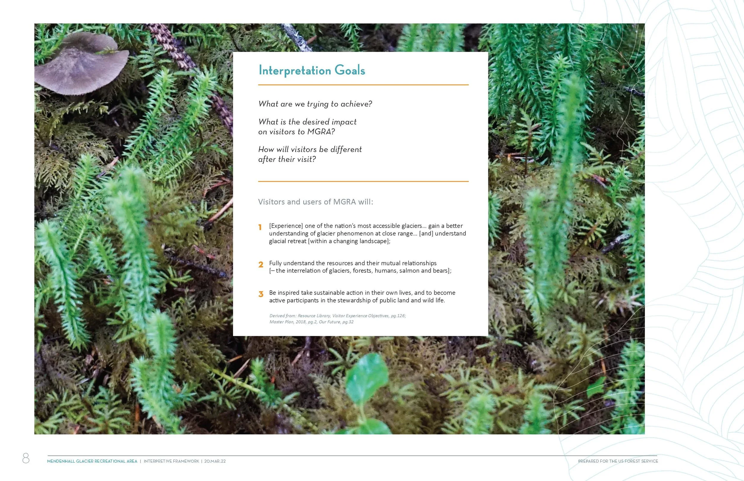 This project takes place in the lands surrounding Mendenhall Glacier, near Juneau. In addition to the preparation of a wayfinding signage masterplan combining traditional Forest Service standards with local Indigenous formline elements, our work includes developing an interpretive framework. This document considers a wide range of visitors’ needs and interests: from the yearly thousands who arrive by cruise ship for 90 minute visits, to the dedicated locals who cherish the lake and forest as a place to relax with their families.