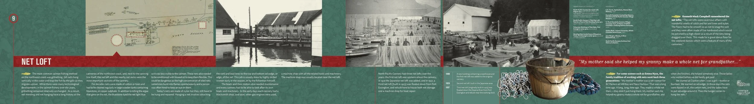 The work was extended to include graphic storytelling at the nearby outdoor museum of North Pacific Cannery. At this location, our approach was to design layered and rich graphic panels which floated over the edge of boardwalk railings. The effect was to create informative displays that were available when visitors wanted to know more, but non-obtrusive in allowing them to experience the immersive oceanfront industrial location.