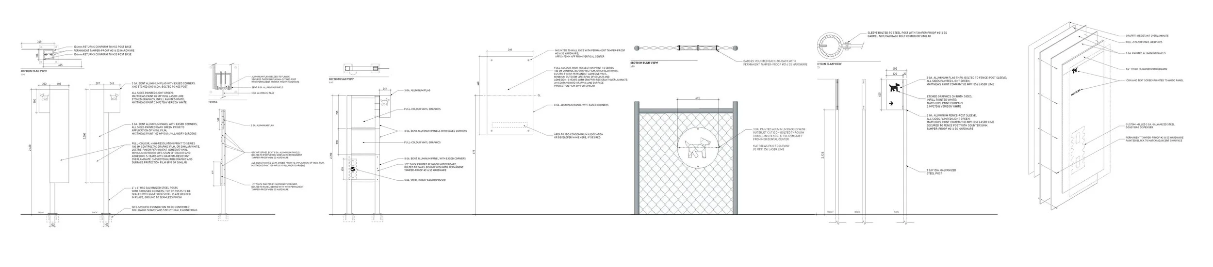 The signage graphics took a simple approach, borrowing colours, typography and other icon information from existing City parks standards. Materials and forms—including aluminum printed surfaces and galvanized posts and frames—were designed to be prepared by the city sign shop.