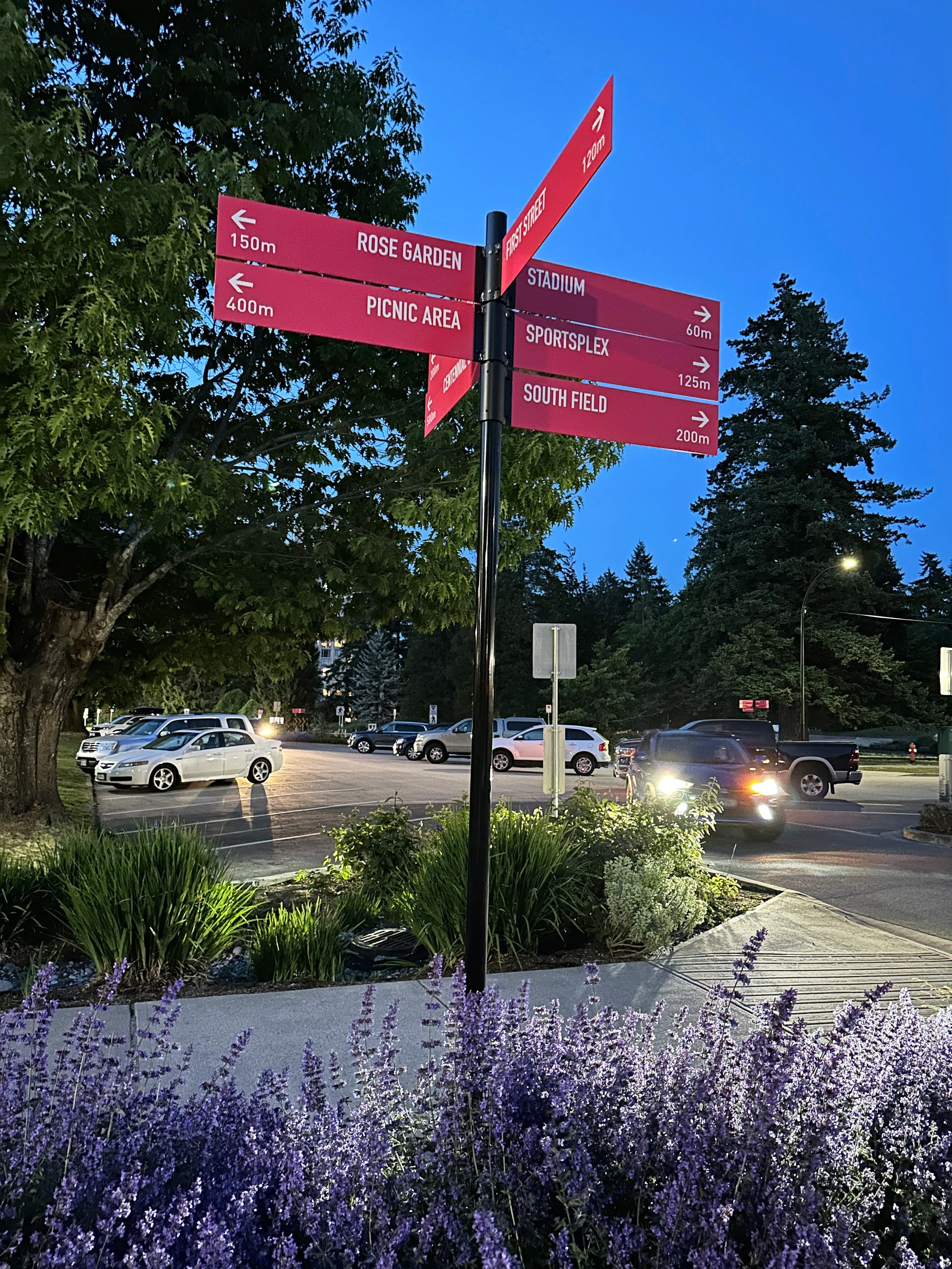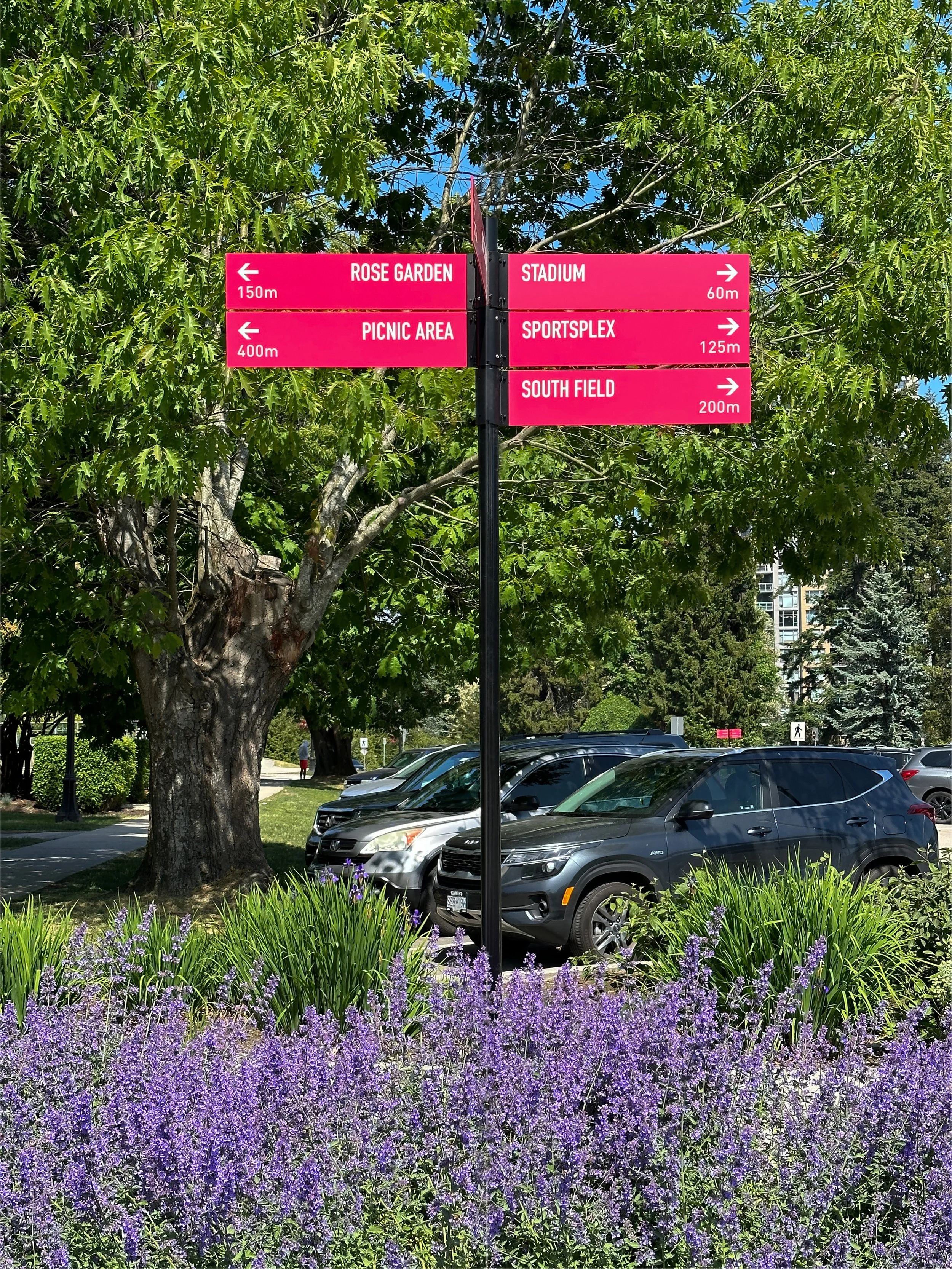 Queen’s Park is a large forested green space in New Westminster that also includes an arena, baseball diamonds, soccer fields and playgrounds. With an array of outdoor amenities the wayfinding program needed to be highly visible and communicate destinations clearly. Having designed other sign programs in the city, our team designed the signs to coordinate with existing park signage, including wayfinding at Quayside Park on the Fraser River. The signage was built by Innovative Signage, and designed to pick up on historic sporting clues—such as local team the Salmon Bellies—as well as colour, and typography that are already evident within the park.