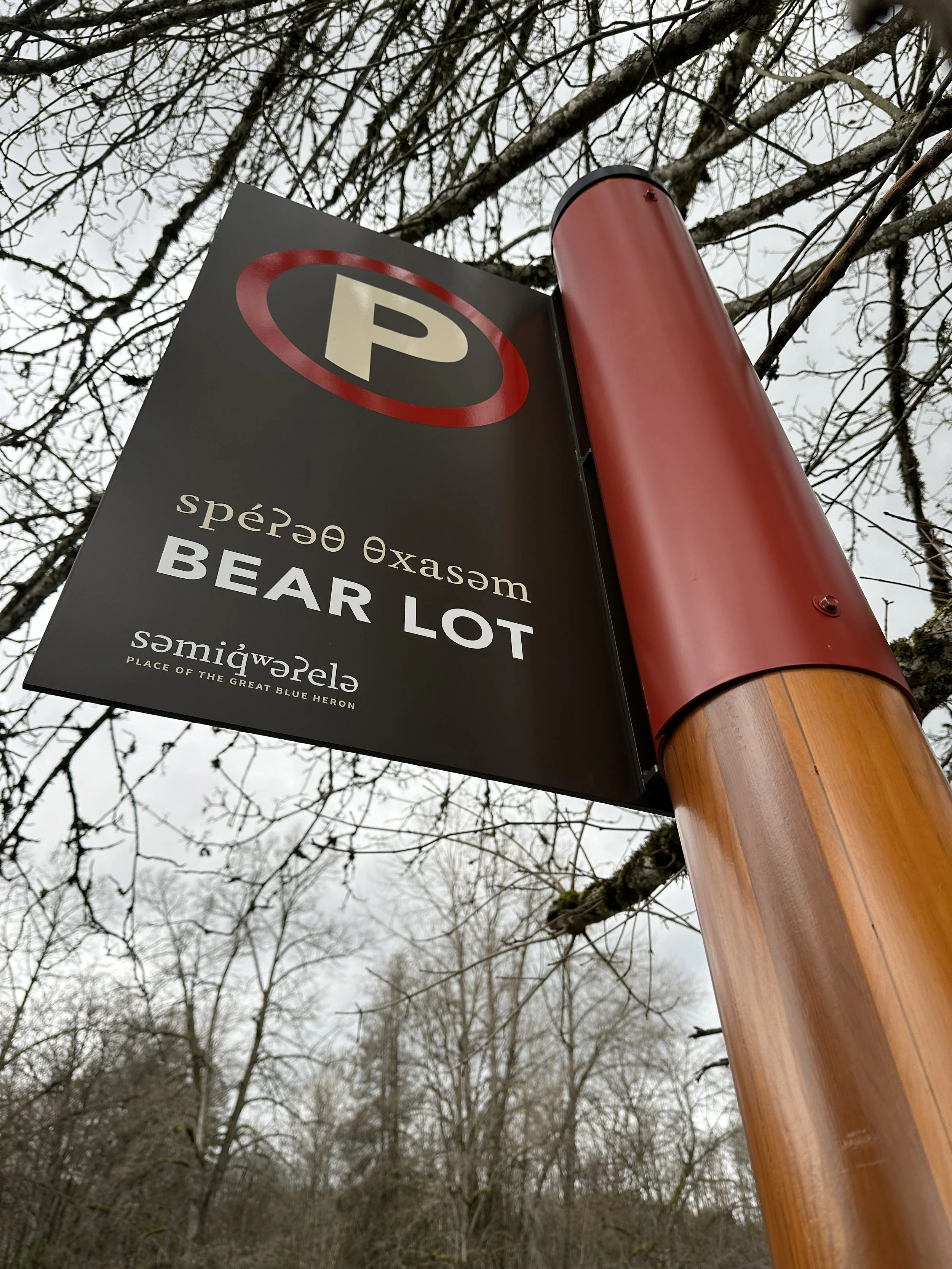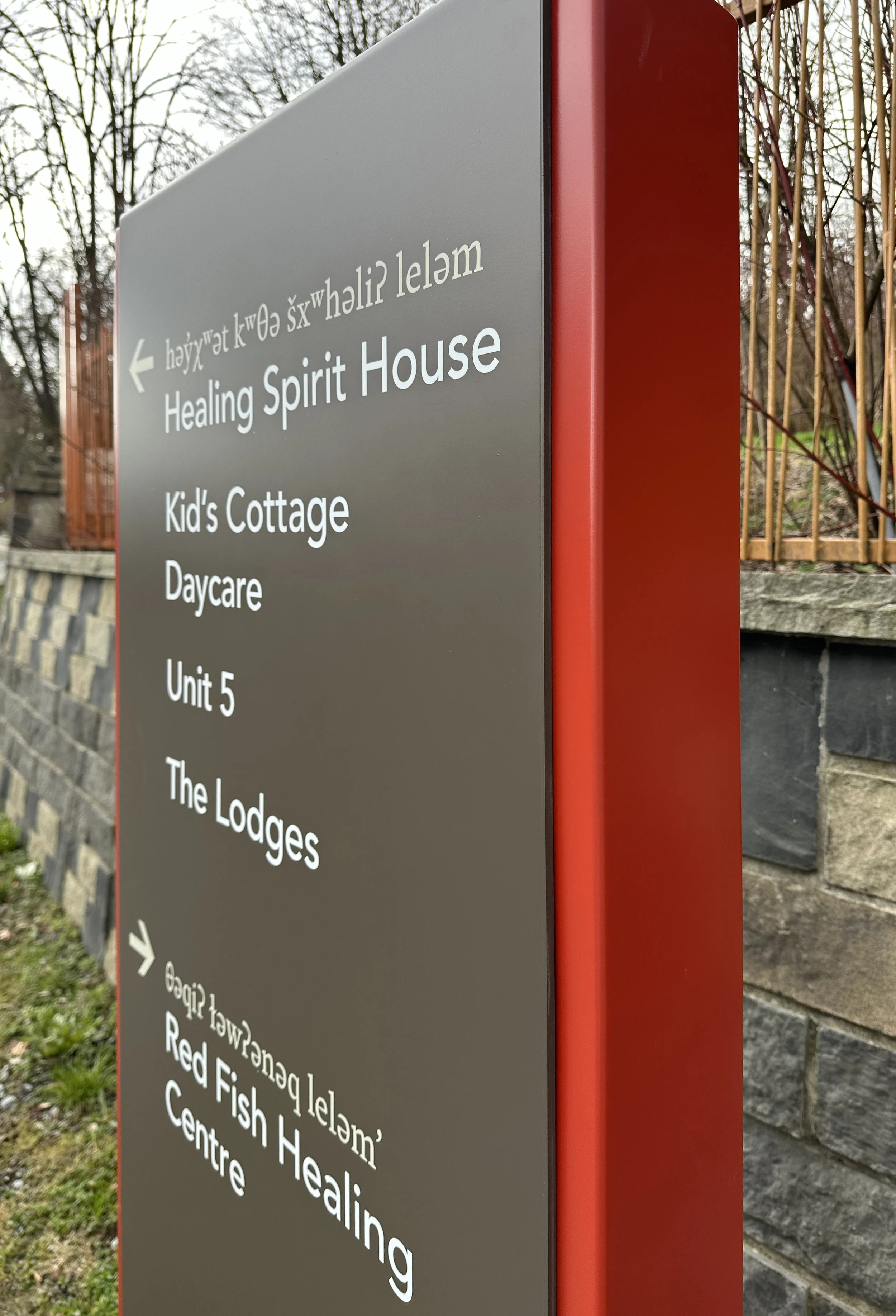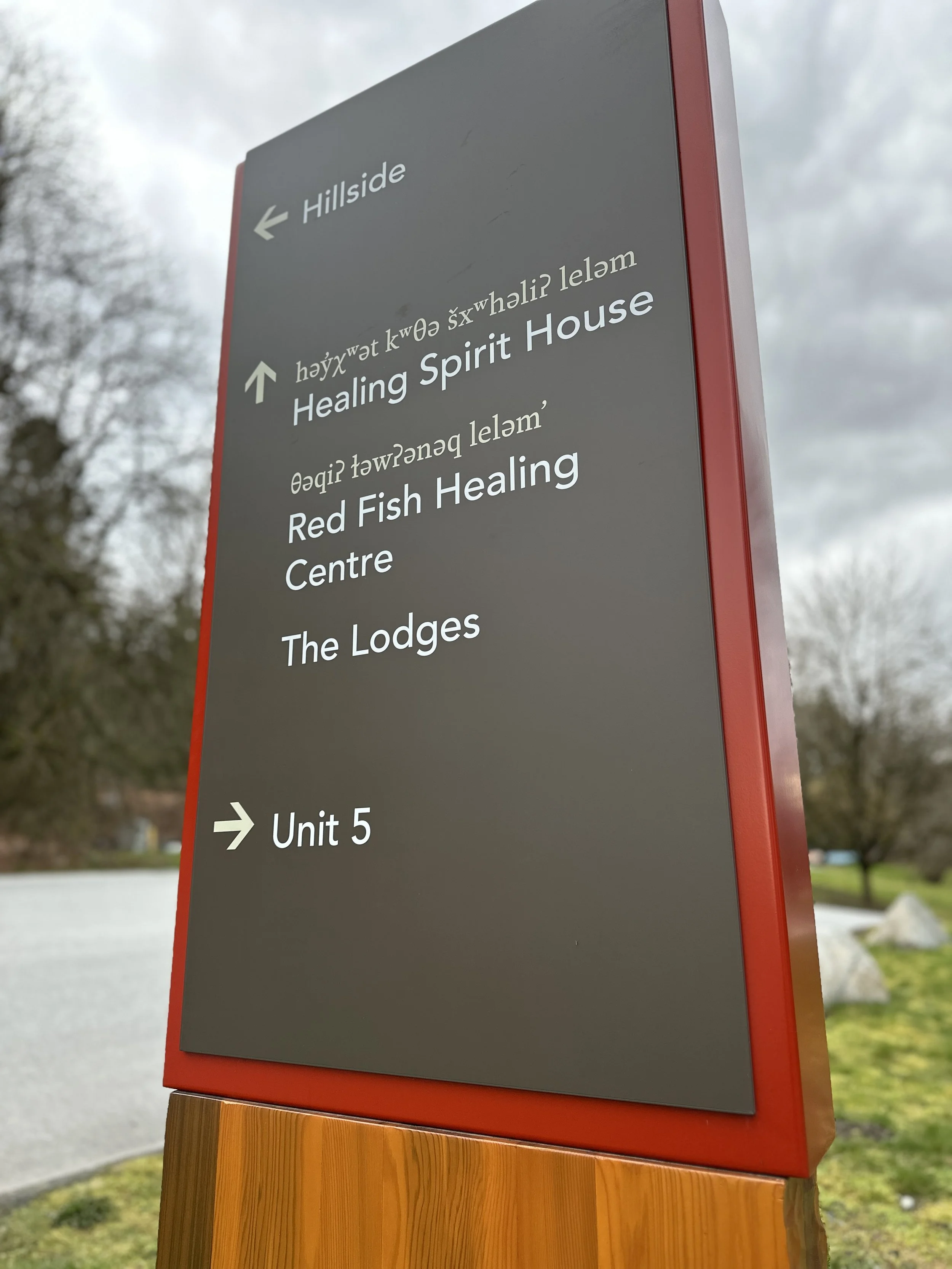 Our team developed a new exterior wayfinding masterplan with BC Housing and kʷikʷəƛ̓əm First Nation for the site for this 244 acre site (formerly Riverview), now home to several new mental health and substance use programs as well as a unique ecosystem of trees, plants and wildlife. Pronounced suh-mEE-kwuh EL-uh – meaning Place of the Great Blue Heron – the land is within the ancestral and core territory of kʷikʷəƛ̓əm. This 244-acre site (formerly Riverview) is now home to several new mental health and substance use programs as well as a unique ecosystem of trees, plants and wildlife. As part of a forthcoming masterplan, our team has been working with BC Housing and kʷikʷəƛ̓əm First Nation to design a new exterior wayfinding system for the site. A central aspect of this system is the integration of the language and artwork of kʷikʷəƛ̓əm. Key destinations and pathways have been identified in english and hən̓q̓əmin̓əm̓.