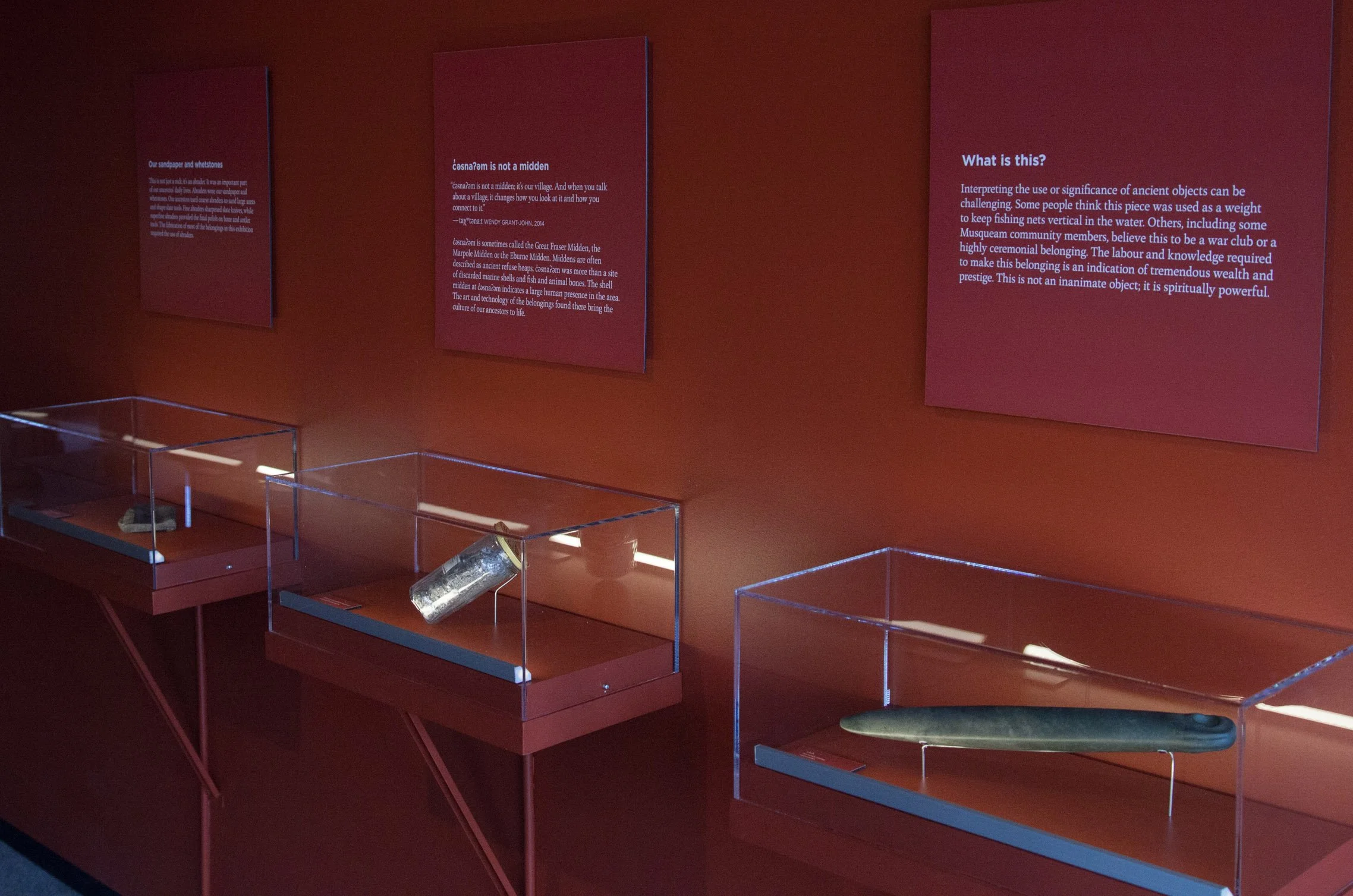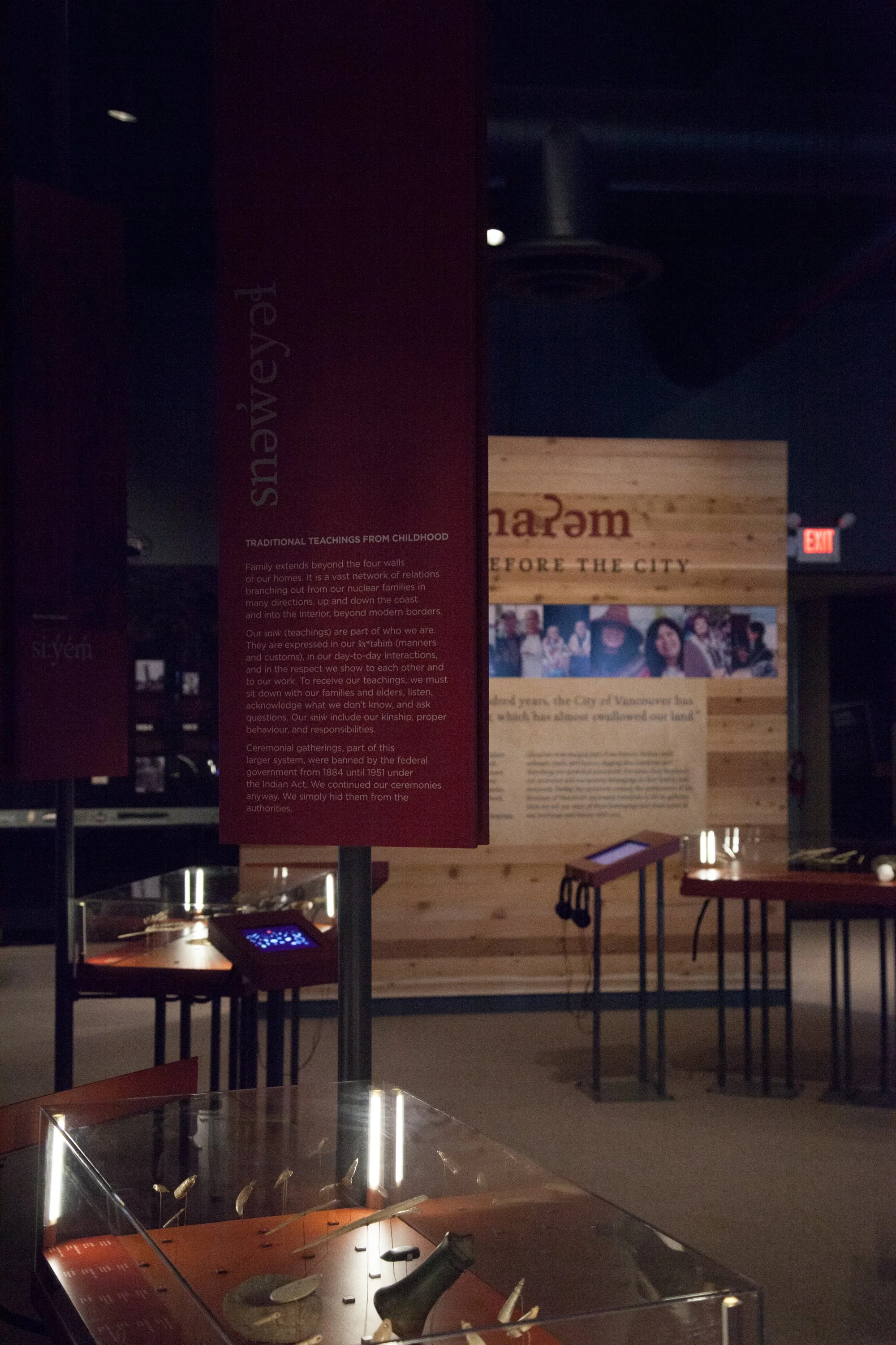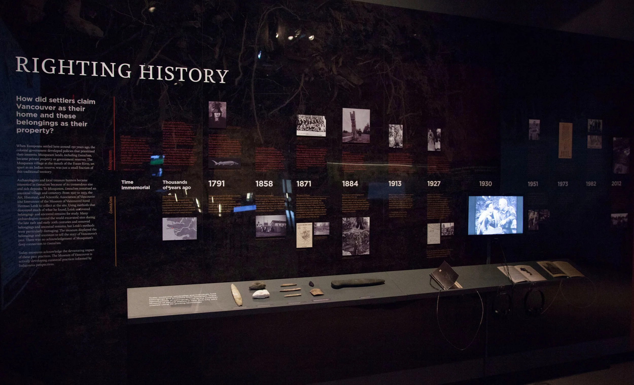 Our team designed this exhibition as the new entryway to the history of Vancouver at the Museum of Vancouver. The project is called “c̓əsnaʔəm—The City Before the City,” and it’s centred around historical belongings and contemporary culture of xʷməθkʷəy̓əm (Musqueam), who are among the traditional stewards of the unceded territory on which Vancouver was built.