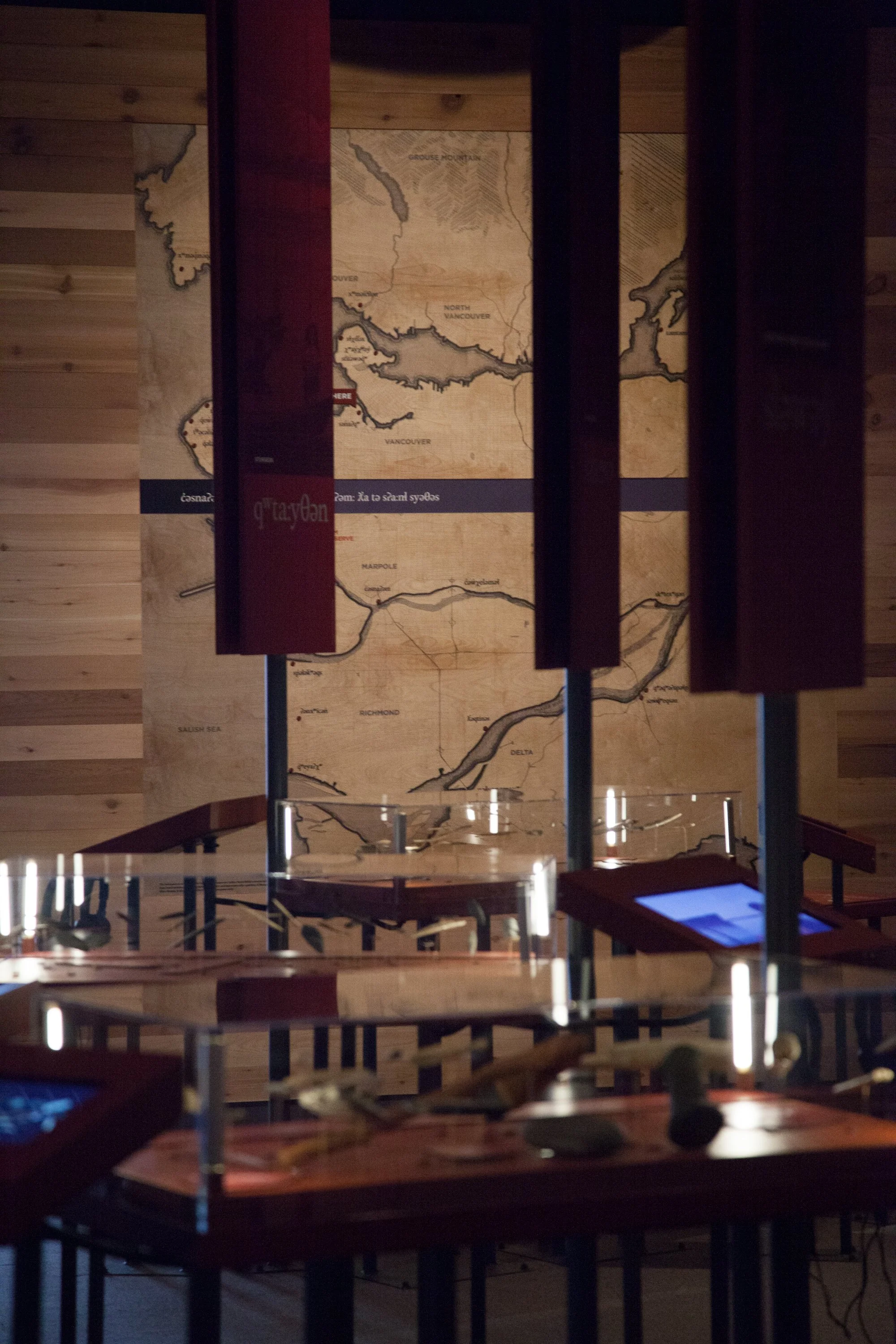 One large wall features an enormous animated mythical creature, essential to the origin story of xʷməθkʷəy̓əm. Complimented by the delicate belongings, hovering in softly lit cases, the wall comes alive in textured black and white motion.