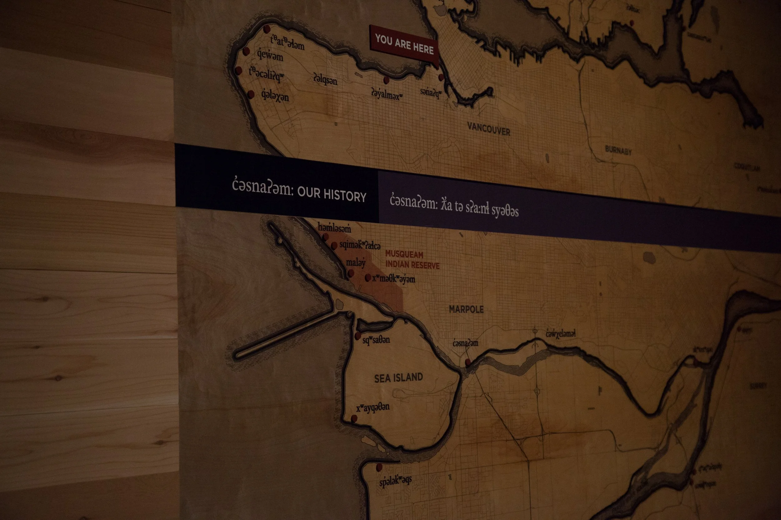 Because language is so critical to identity, and comes from relationships to the land, hən̓q̓əmin̓əm̓ language text is foregrounded. Beginning with the title and a traditional welcome that is translated into english and french, the graphic elements reinforce this hierarchy of communication. A direct printed wood panel features a map of the city of Vancouver overlaid with place names which have been known to the xʷməθkʷəy̓əm for generations. This graphic, however, is a starting point to a new world view for most others who see the area through a colonizing lens.